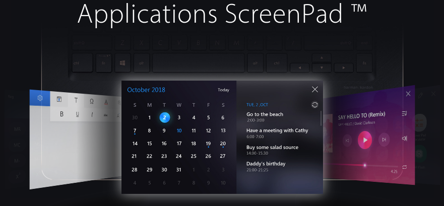 Plus révolutionnaire que la Touch Bar du MacBook Pro qui remplace les touches de fonction, le ScreenPad combine les fonctions d’un pavé tactile standard avec un écran tactile LCD haute résolution. Il est possible d’exécuter des applications spéciales ScreenPad comme une calculatrice ou un lecteur de musique et peut également fonctionner en mode adaptatif avec des applications de bureau, des fonctionnalités et des outils qui changent automatiquement en fonction de la tâche en cours. Un kit de développement logiciel (SDK) complet est également disponible, afin que les développeurs puissent créer et étendre les possibilités du ScreenPad.