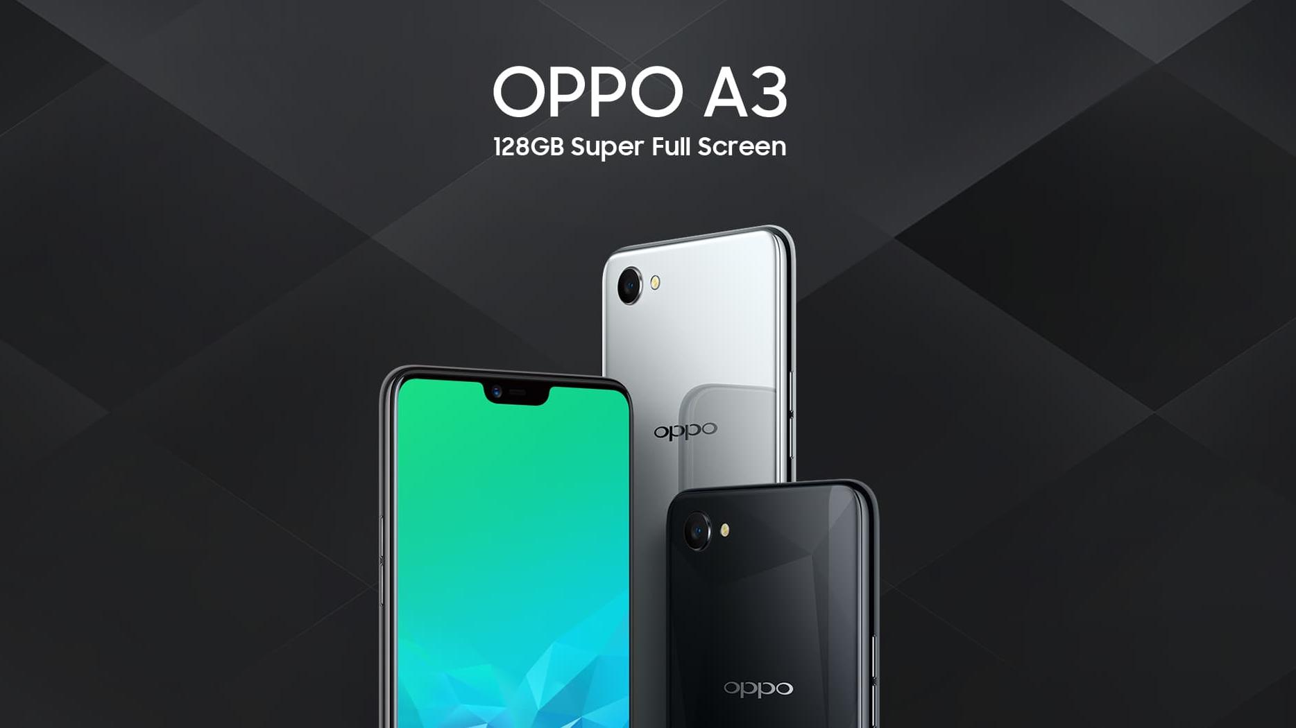 - L’OPPO A3 est doté d’un écran full HD+ de 6,2 pouces avec un ratio écran / corps de 88%, une batterie de 3400mAh, une double caméra de 16 MP avec AutoFocus et 8 MP, 128 Go de mémoire interne et 4 Go de RAM .