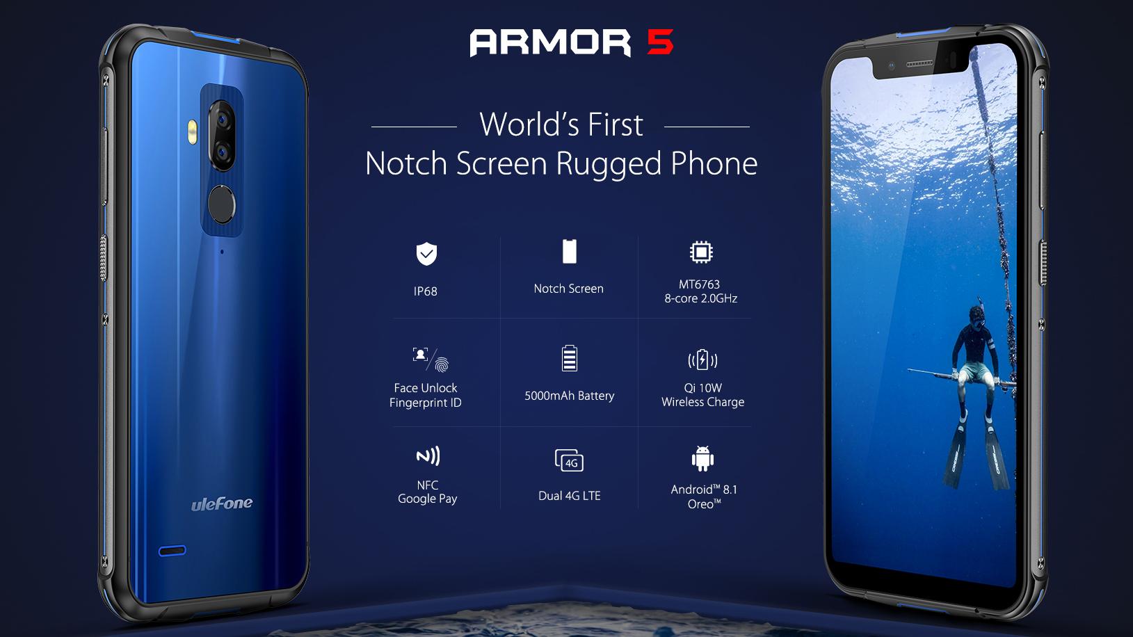 Ulefone a annoncé le 25 juillet 2018 le Armor 5, le premier smartphone au monde antichoc / étanche avec un écran à encoche.