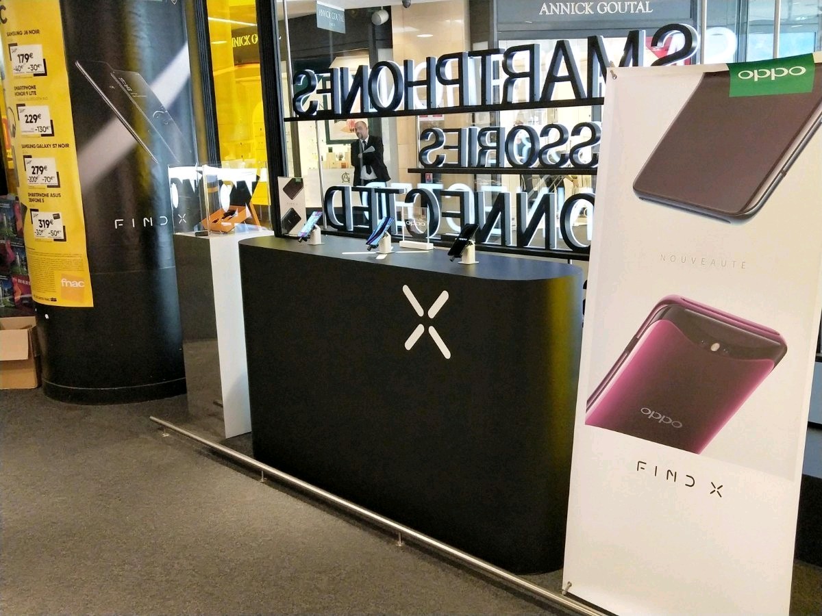 Impossible de rater les smartphones OPPO à la Fnac Paris – Champs-Elysées avec un joli présentoir et quelques modèles du Find X en exposition , l’un des premiers smartphones avec une module rétractable qui laisse apparaître les capteurs.