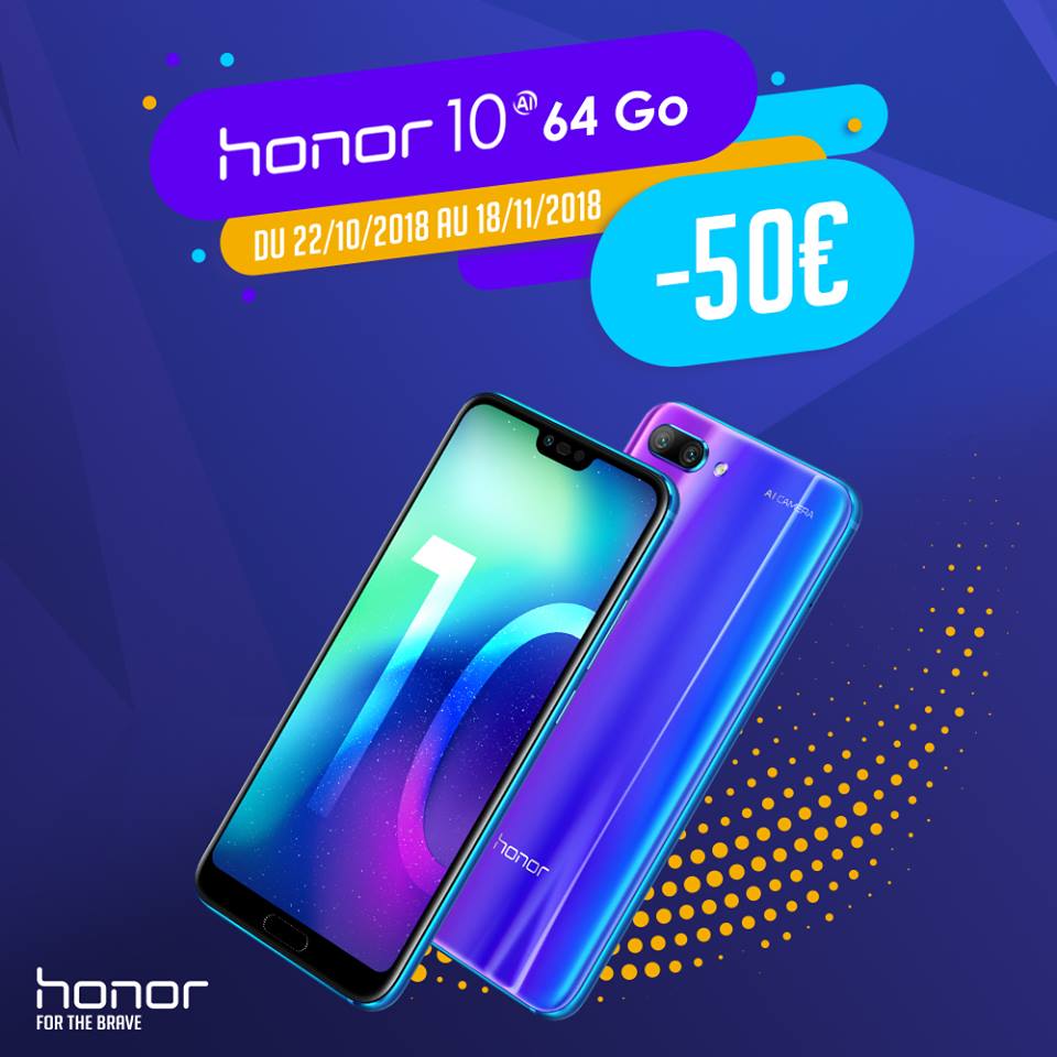 Du 22 octobre au 18 novembre 2018, Honor rembourse 50€ pour l’achat d’un Honor 10 – 64 Go chez : Auchan, Avélis Télécom, Bouygues Telecom, Boulanger, Carrefour, Casino, Cdiscount, Coqwel, Electro Dépôt, Free, Fnac, Darty, Leclerc, LDLC, Materiel.net, Orange, SFR, Système U, Sosh, Welcom, Hihonor.com, hors marketplace.