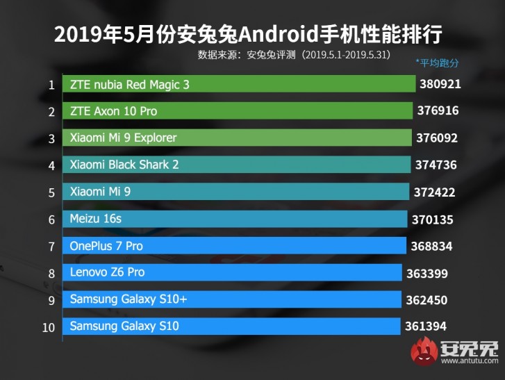 En tête de liste se trouve le Red Magic 3 avec une score de 380921 points, puis le Axon 10 Pro et le Xiaomi Mi 9 Explorer. S’en suit le Black Shark 2, Mi 9, le Meizu 16s et enfin le très médiatisé OnePlus 7 Pro qui se retrouve à la septième place. Les Samsung Galaxy S10+ et S10 se retrouvent à la neuvième et dixième place avec un score inférieur de 20 000 points par rapport au premier.