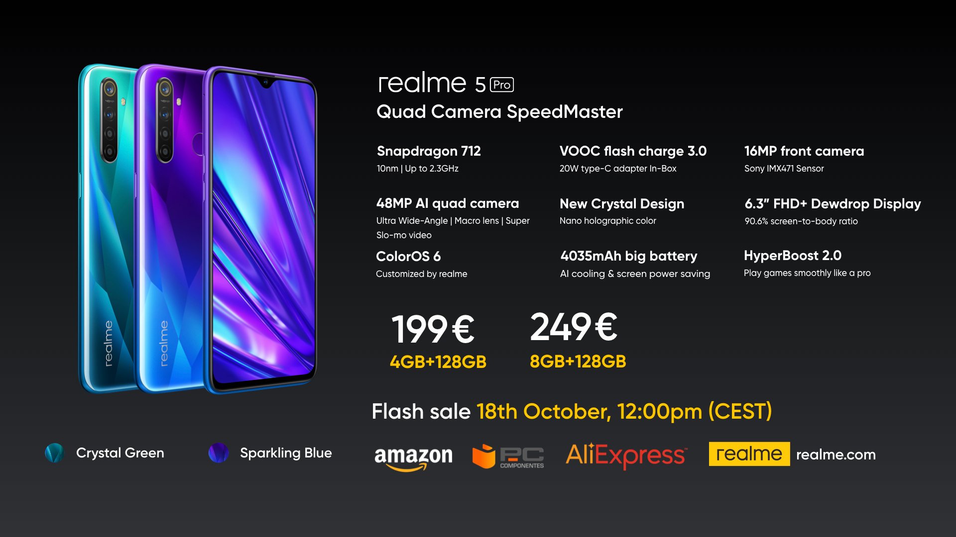 Le realme 5 Pro est propulsé par un processeur Qualcomm Snapdragon 712 AIE accompagné par 4 Go ou 8 Go de RAM LPDDR4x et 128 Go de mémoire de stockage UFS 2.1 extensible par microSD jusqu’à 256 Go.