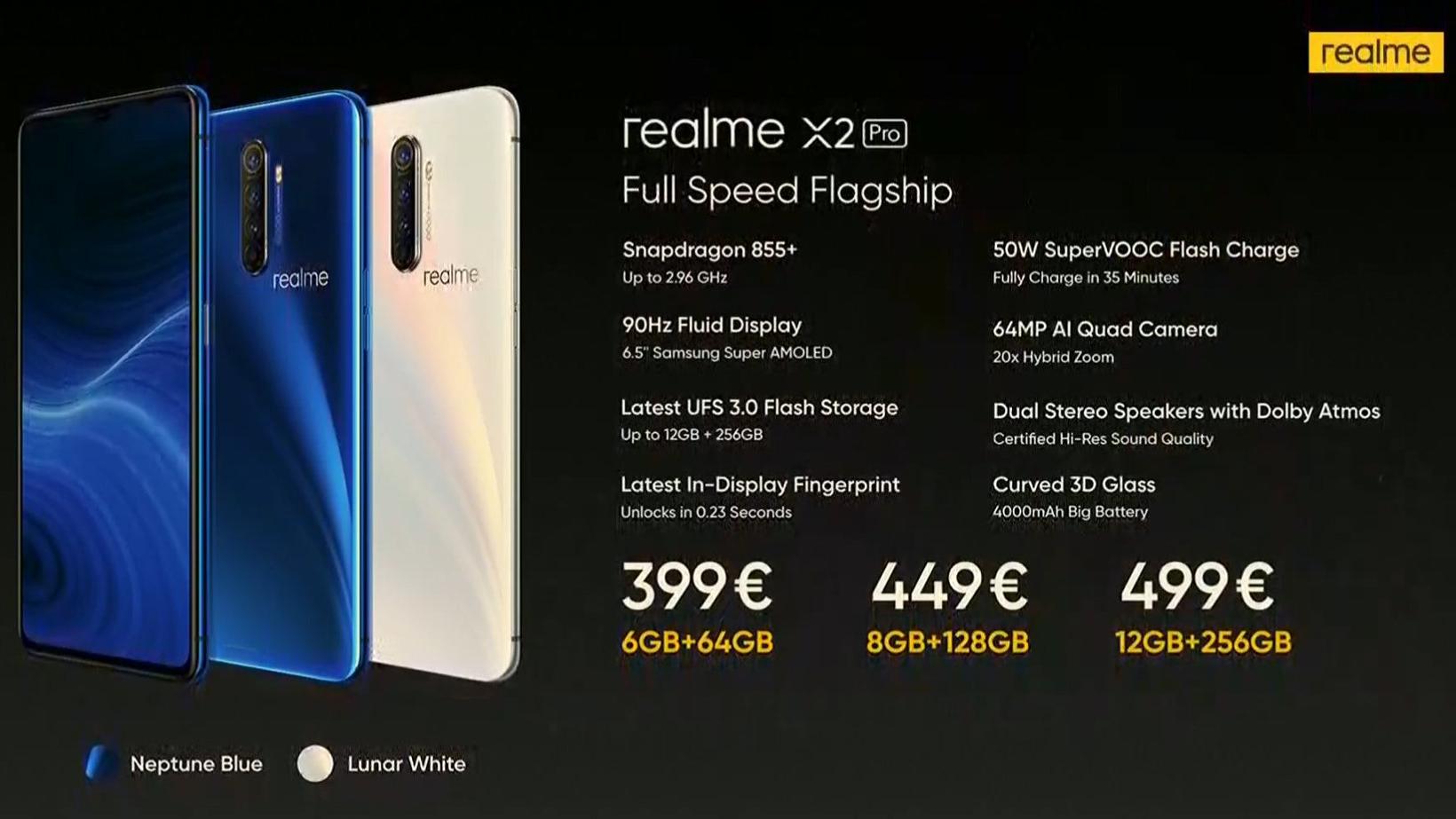 Le realme X2 Pro sera disponible début novembre 2019 à partir de 399€ la version équipée de 6 Go RAM + 64 Go ROM, 449€ la version 8+128 et 499€ pour la version 12 Go + 256 Go !