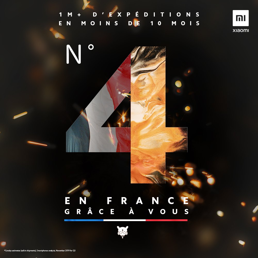 Xiaomi France a annoncé être en quatrième place des vendeurs de smartphones en France au troisième trimestre 2019 avec 8% de parts de marché et plus d’un million de smartphones vendus en seulement dix mois.