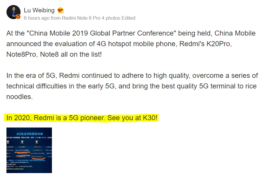 Lu Weibing, vice-président du groupe Xiaomi et directeur général de Redmi, a annoncé sur le réseau social Weibo que le Redmi K30 5G sera le smartphone pionner en 2020.