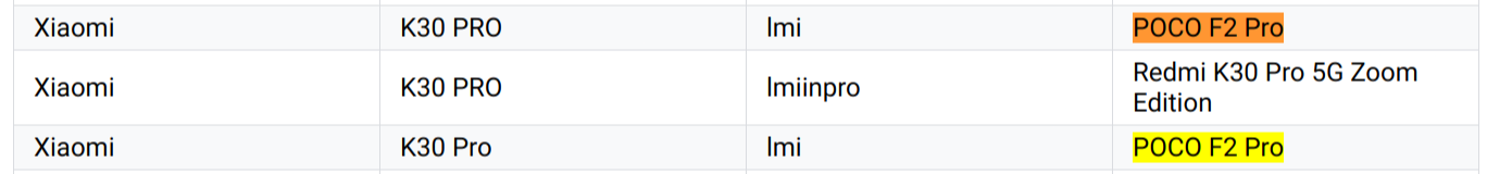 Une preuve vient de surgir de la liste des terminaux éligibles aux Services Google, puisque le « K30 Pro » comme « nom marketing » est confirmé en tant que « Modèle » : « POCO F2 Pro ».