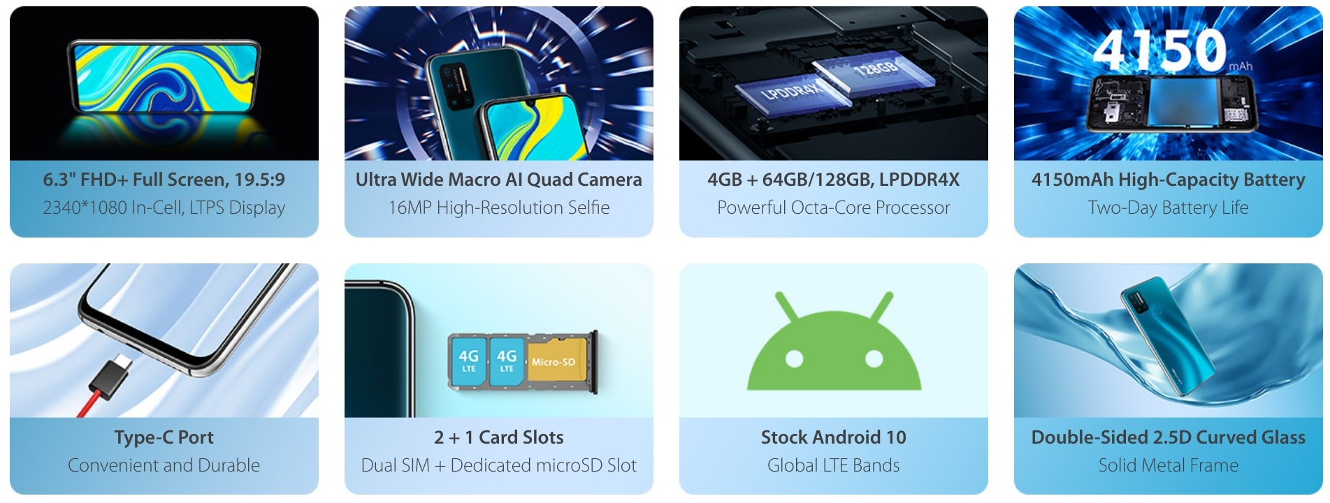 Sous Android 10 (stock), l’autonomie est garantie par une batterie de 4150 mAh avec charge classique en 10 Watts par le port USB-C. Au total, le UMIDIGI A7 Pro pèse 212 grammes.