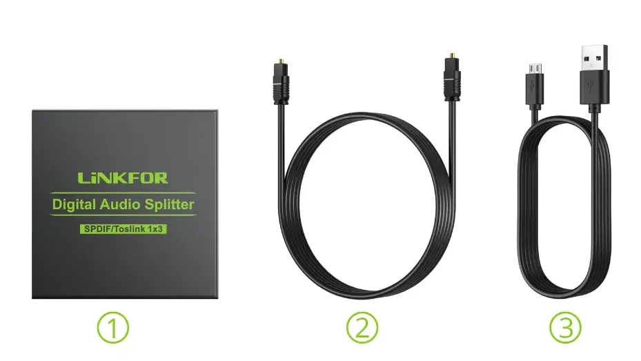 Le splitter audio numérique LiNKFOR possède 1 entrée et 3 sorties SPDIF / Toslink ainsi qu’un cordon USB à brancher directement sur la TV pour qu’il soit alimenté.