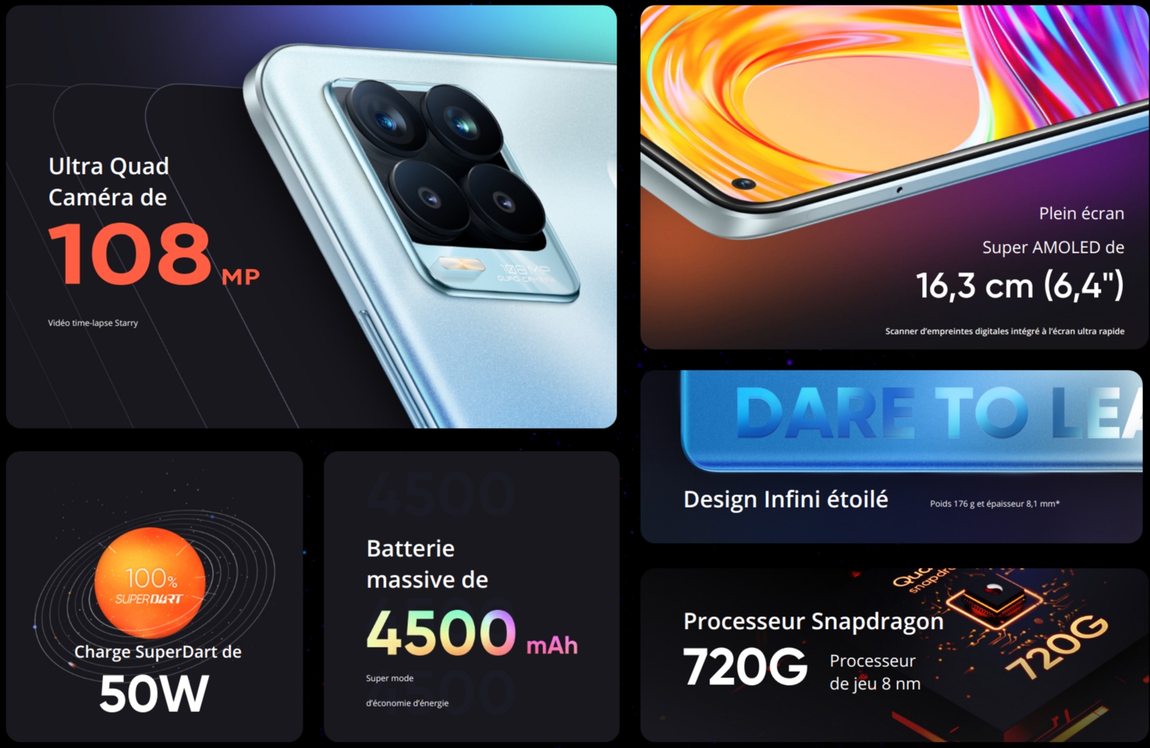 Le realme 8 Pro est propulsé par un processeur Qualcomm Snapdragon 720G épaulé par 8 Go de mémoire RAM LPDDR4X et 128 Go de mémoire de stockage UFS 2.1 extensible par microSD.