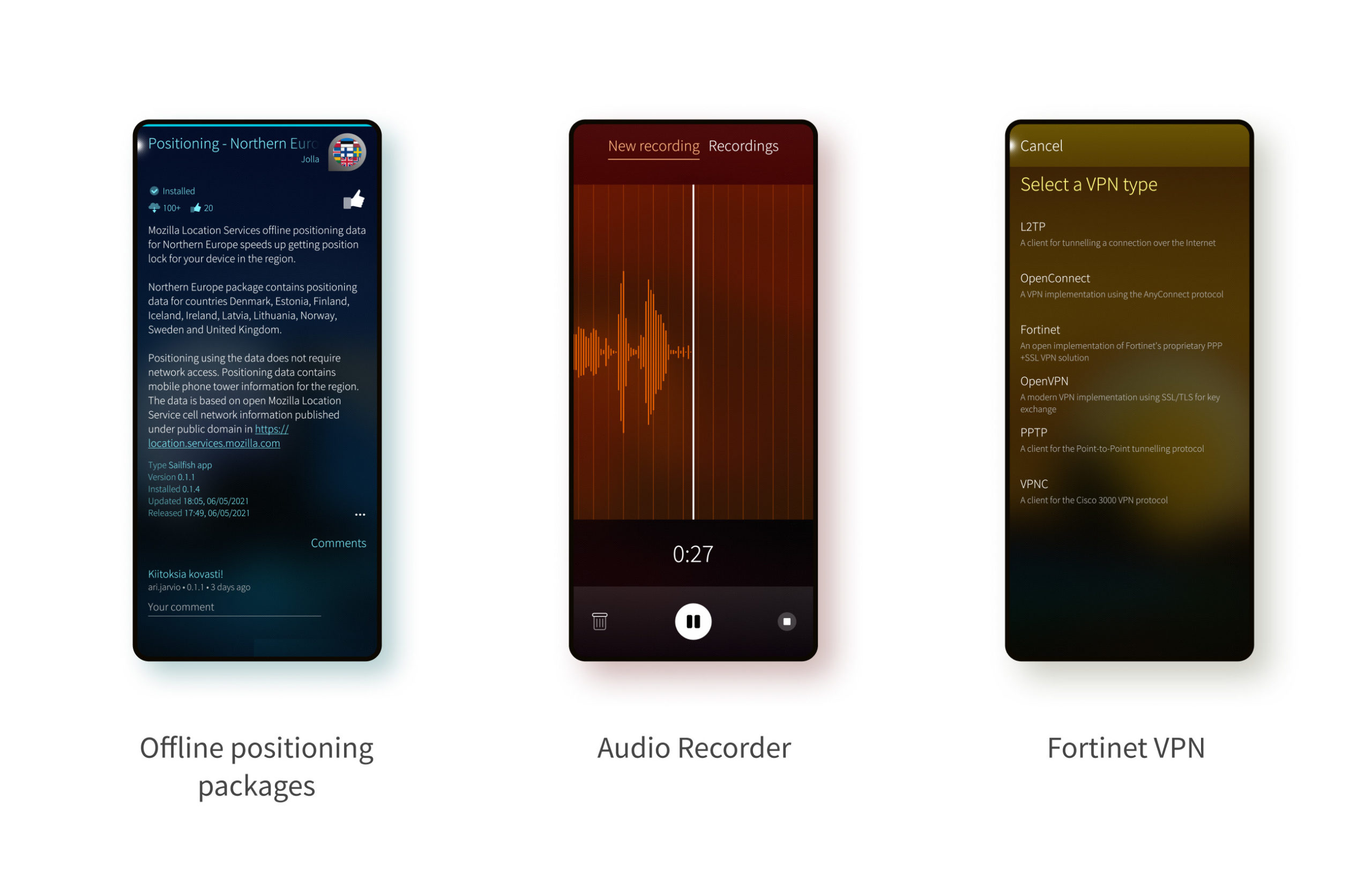 Jolla a également développé des nouvelles applications disponibles dans la boutique avec un enregistreur audio, un client VPN Fortinet et le service de géolocalisation Mozilla Location Service, service ouvert et participatif basé sur des sites cellulaires et des points d’accès Wi-Fi visibles publiquement.