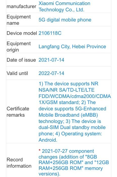 Le Xiaomi Mi MIX 4, sous le numéro de modèle 2106118C, vient d’être certifié par l’organisme chinois TENAA qui révèle que le smartphone sera disponible au moins en deux versions, l’une équipée de 8 Go de mémoire RAM et l’autre de 12 Go avec 256 Go d’espace de stockage.