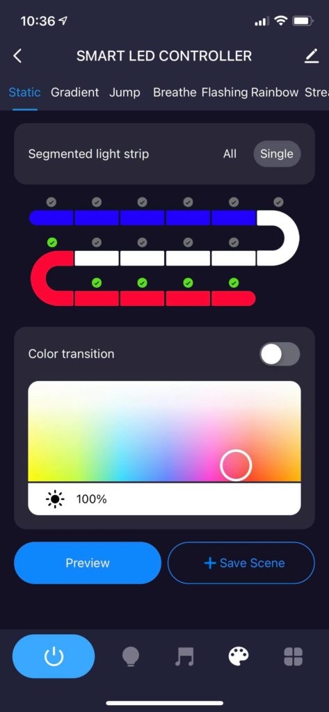 Elles possèdent aussi le mode musique qui permettra de faire des soirées sympathiques au rythme de la musique, avec ce produit une option intéressante est introduite puisque vous allez pouvoir gérer vous-même les couleurs par section en créant des scènes.