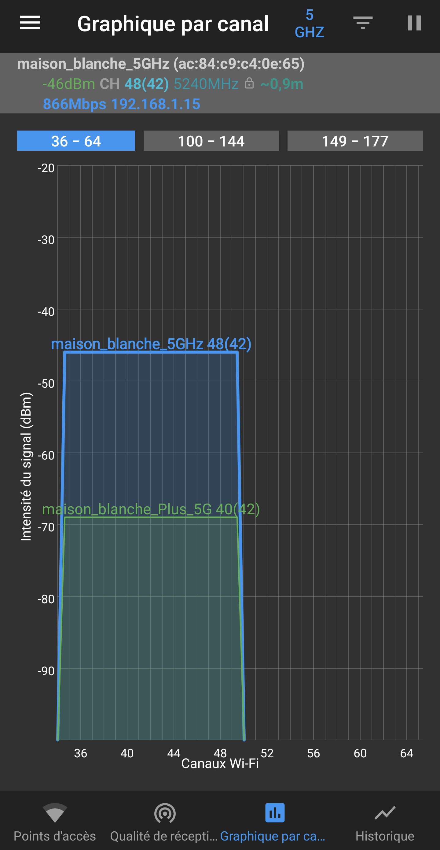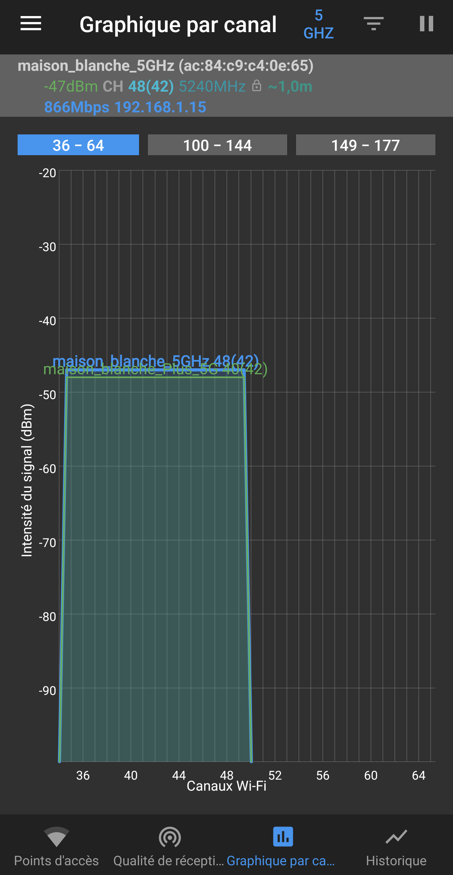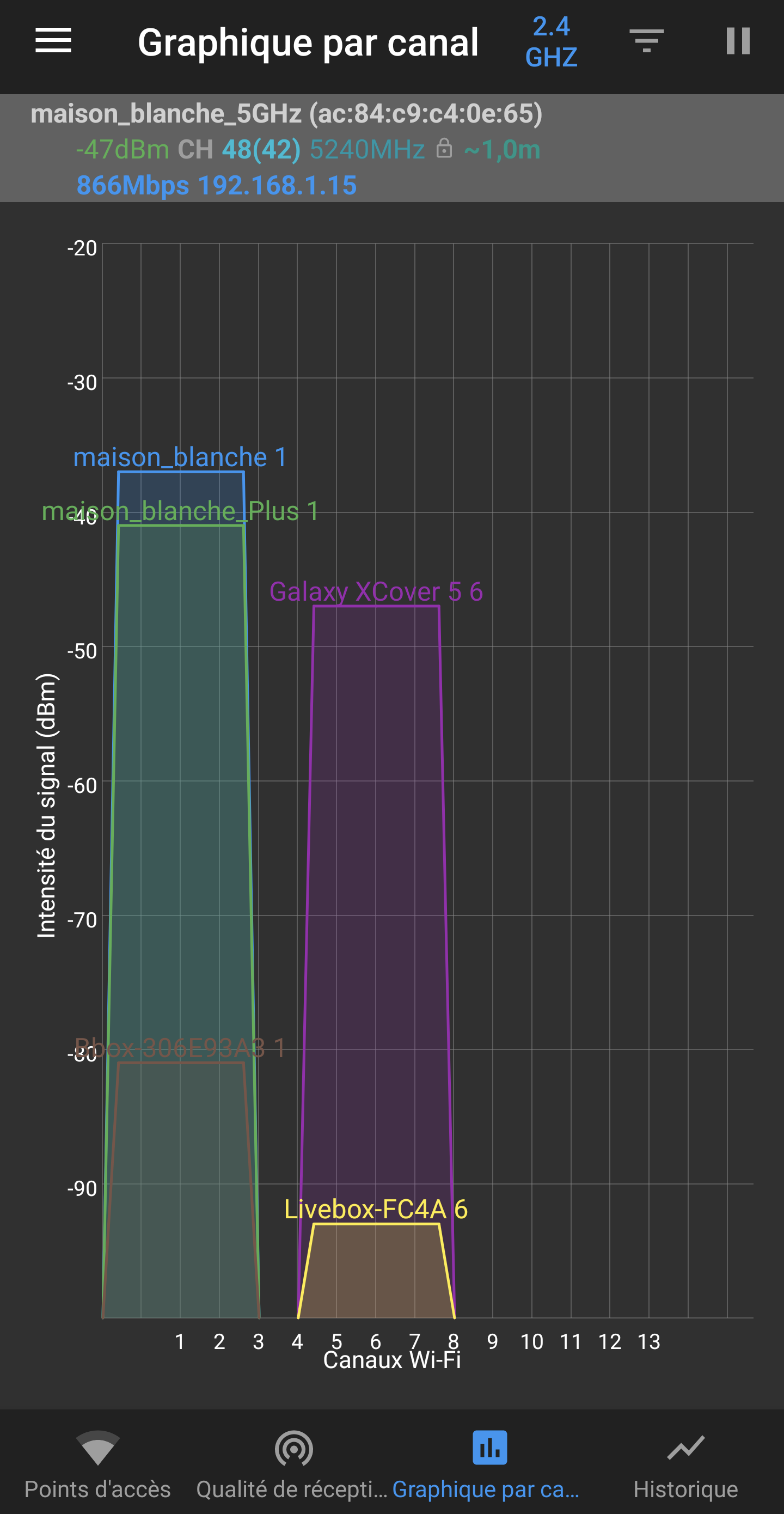 Dans la même pièce, avec la Livebox 4 (maison_blanche) et le Mi WiFi Range Extender AC1200 côte à côte, l’intensité du signal que ce soit en 2,4 Ghz ou 5 Ghz est sensiblement la même, un peu inférieure pour le répéteur WiFi (avec la mention « _Plus »).