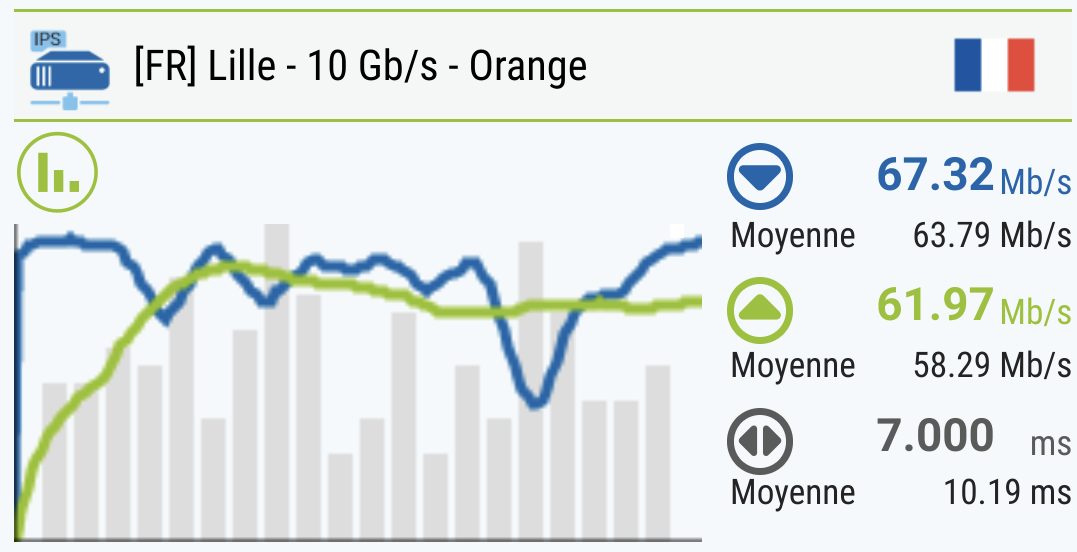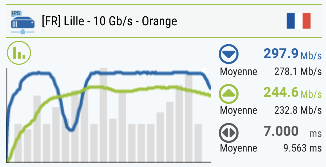 La connexion fibre est vendue pour 300 Mbps symétrique. En mesurant à la box (capture de gauche), le débit et le ping y est. Il faudra par contre compter un débit divisé par environ quatre à proximité du répéteur tout en gardant un ping avantageux (capture de droite). La puissance du signal est donc au rendez-vous, mais le débit peine un peu à monter. L’emplacement du répéteur est donc judicieux, tout comme l’utilité que vous en aurez.