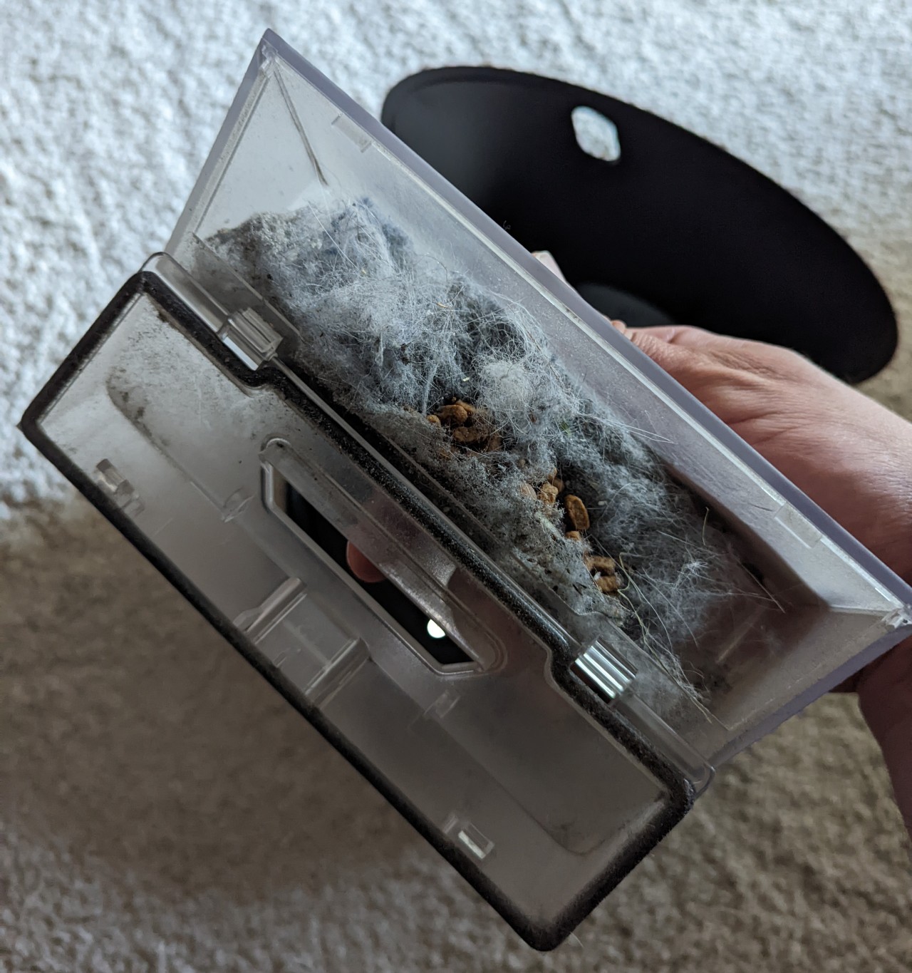 Pour vider le bac, il suffit d’ouvrir le capot par l’avant et de le retirer, le robot annonce alors que le bas a été retiré. Une fois vidé à la poubelle, avec un petit souffle sur le filtre à air pour garantir une bonne aspiration sur le long terme, il suffit de réenclencher le bac et le robot va annoncer l’action.
