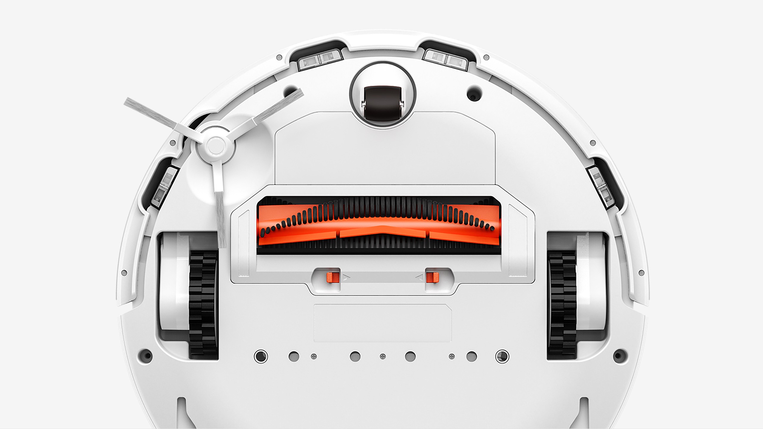 Le robot semble de bonne facture et s’impose avec ses dimensions de 350 mm de diamètre et 94,5 mm de haut pour un poids avoisinant les 4 Kg. La moitié de l’avant est réservée aux capteurs d’obstacles alors que le laser tourne à toute vitesse pour analyser l’environnement. À l’arrière, se trouve l’expulsion de l’air et les connecteurs de charge. En dessous, se trouve une roue qui pivote à 360° et les deux roues motrices montées sur des bras, ce qui permet au robot de monter des tapis assez épais, sans broncher. Bien entendu, on y retrouve également la brosse de nettoyage qui se retire simplement pour pouvoir être nettoyée (surtout pour les poils d’animaux).