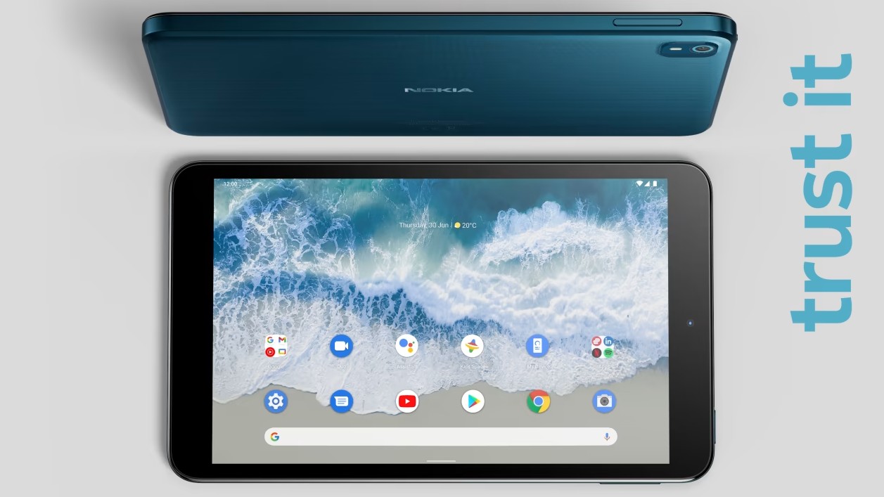 La tablette Nokia T10 est la petite soeur de la Nokia T20 avec un écran plus petit de 8 pouces avec une résolution HD (800 x 1280). Elle est propulsée par un processeur Unisoc T606 épaulé par 3 Go ou 4 Go de mémoire RAM et 32 Go ou 64 Go de mémoire de stockage extensible par microSD jsuqu’à 512 Go. Elle comporte deux capteurs photo, le principal de 8 MP et le frontal de 2 MP. L’autonomie est garantie par une batterie de 5100 mAh avec charge simple à 10 Watts. Le tout sous Android 12 et sans surcouche.