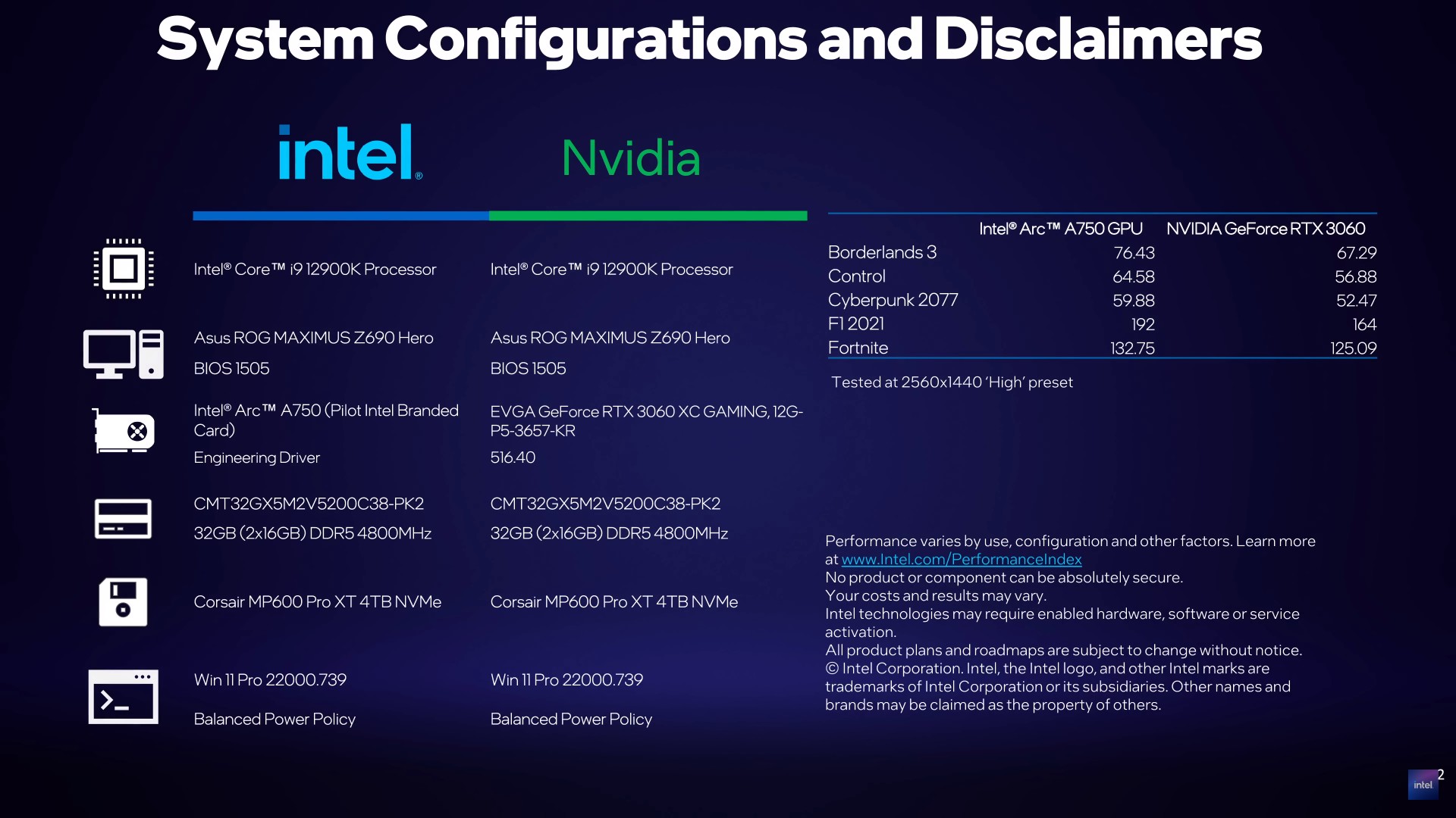 Avant un lancement mondial prévu pour cet été 2022, Intel fait saliver les joueurs PC en comparant sa carte graphique Intel ARC A750 aux performances de la NVIDIA RTX 3060 sur cinq jeux : F1 2021, Cyberpunk 2077, Control, Borderlands 3 et Fortnite. Évidemment, sur ces jeux, la carte Intel surpasse celle de NVIDIA avec 17% de performances en plus en résolution de 2560×1440 pixels.