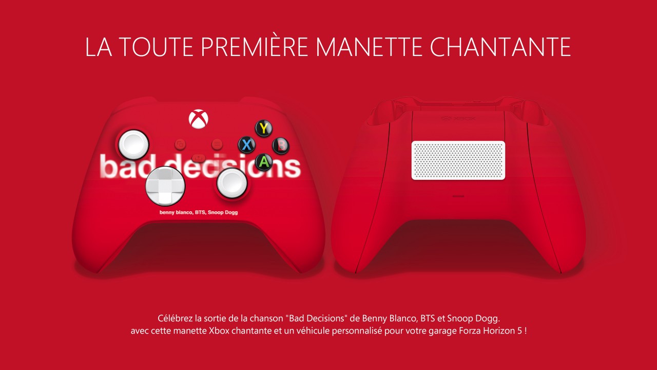 Une nouvelle manette collector Xbox fait son entrée pour les fans du dernier tube de benny blanco, BTS et Snoop Dogg : « Bad Decisions ».Rouge aux boutons blancs avec l’inscription des artistes et du titre de la chanson, elle se distingue également par un haut-parleur placé à l’arrière qui permet d’écouter le titre.