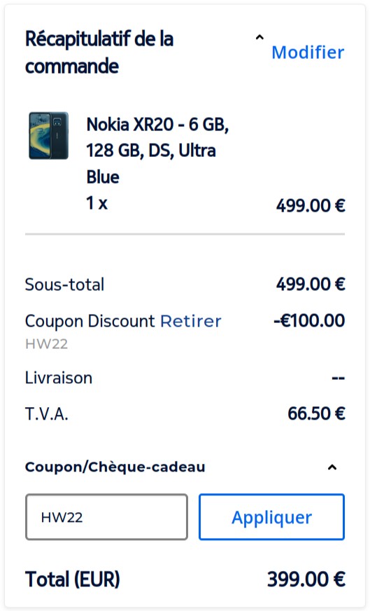 En vous rendant sur la boutique officielle en ligne de NOKIA, le Nokia XR20 initialement proposé à 569€ est passé à 499€. Mais il est possible d’ajouter le code « HW22 » dans le panier pour le faire passer à 399€.