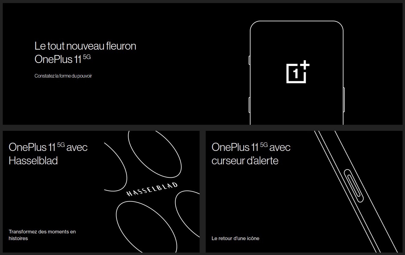 La page officielle laisse le mystère planer sur les caractéristiques du OnePlus 11, mise à part une partie du design dont le module photo arrière marqué « Hasselblad » et le retour du curseur d’alerte. Il est fort probable que ce nouveau fleuron soit équipé du processeur Qualcomm Snapdragon 8 Gen 2 et d’une charge ultra-rapide.