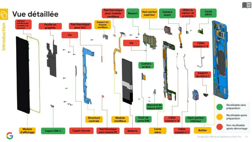 Google France a donc mis en ligne les manuels de réparation des Pixel 6a, Pixel 7 et Pixel 7 Pro avec environ 200 pages d’explications et d’illustrations pour réparer vous-même votre Pixel, de l’écran et passant par la batterie, les capteurs photo et bien plus encore.
