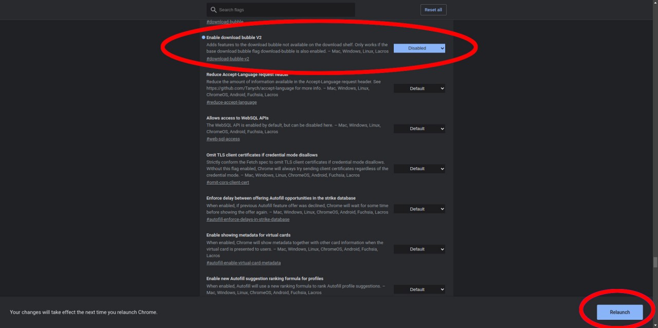 À la ligne « Enable download bubble (V2) » d’origine sur « Default« , changez par « Disabled« . Une barre s’affiche en bas du navigateur « Your changes will take effect the next time you relaunch Chrome« , cliquez sur « Relaunch« .