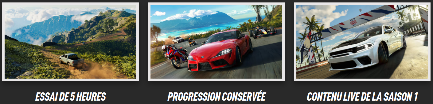 Pendant quatre jours, du 14 au 17 septembre 2023, il sera possible de jouer gratuitement à The Crew Motorfest avec comme seule limite : 5 heures de jeu. L’essai donne le droit de parcourir toute la carte, de jouer aux différentes playlists, de jouer en ligne, de profiter du Pass année 1 contenant 25 véhicules supplémentaires et bien plus encore.