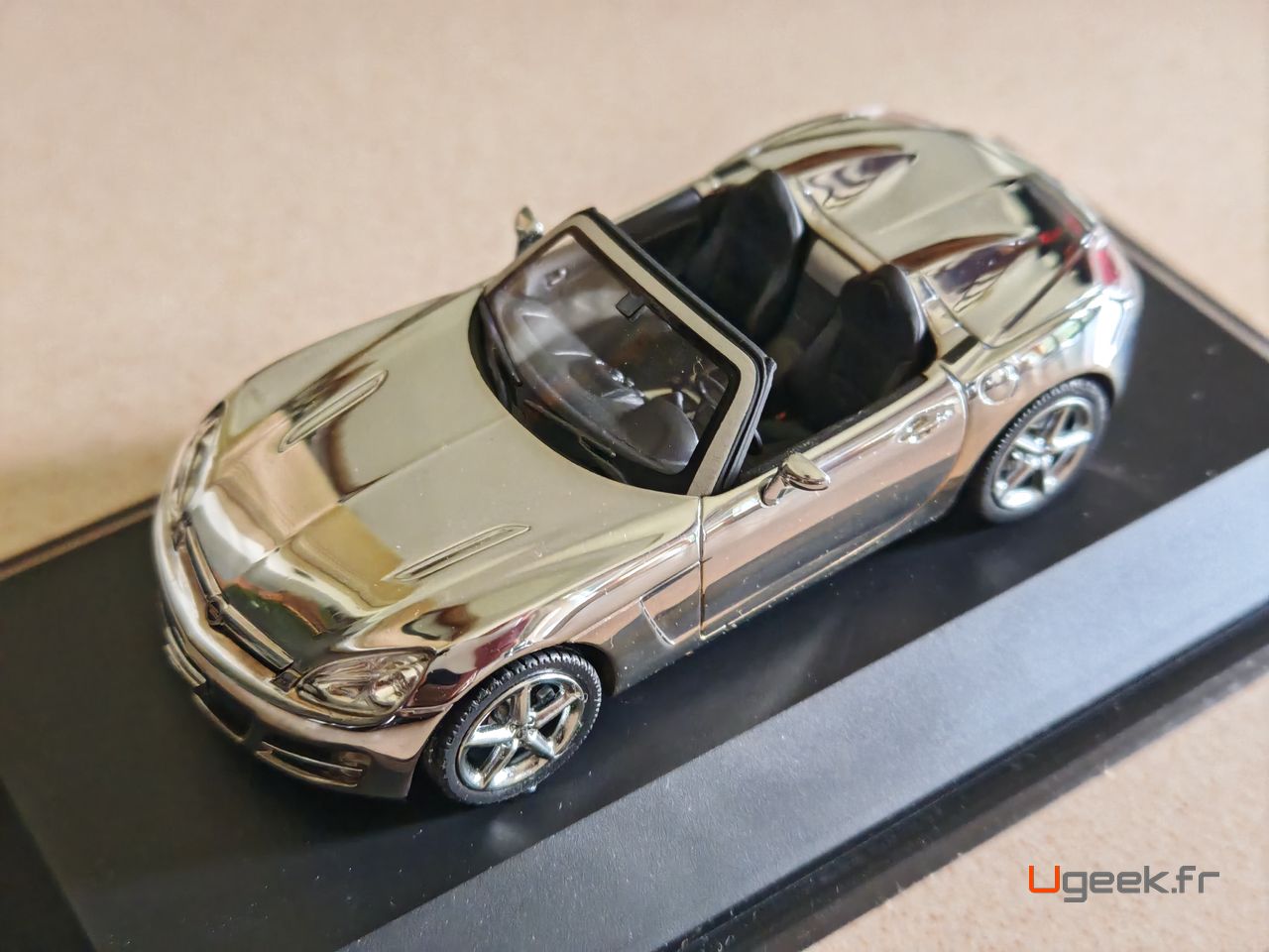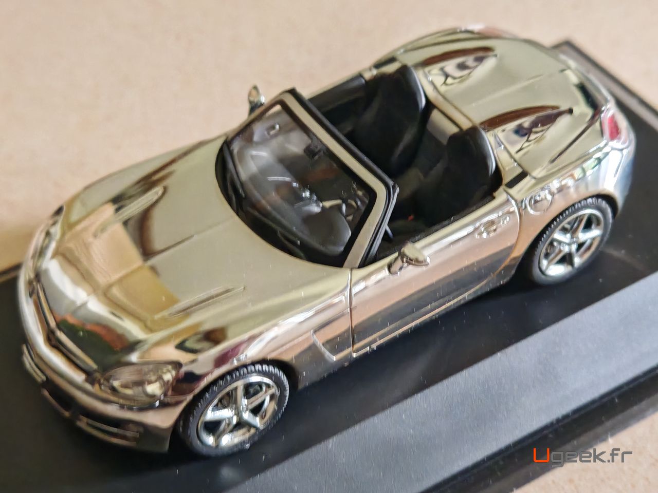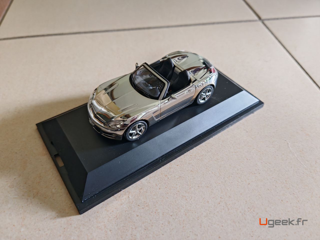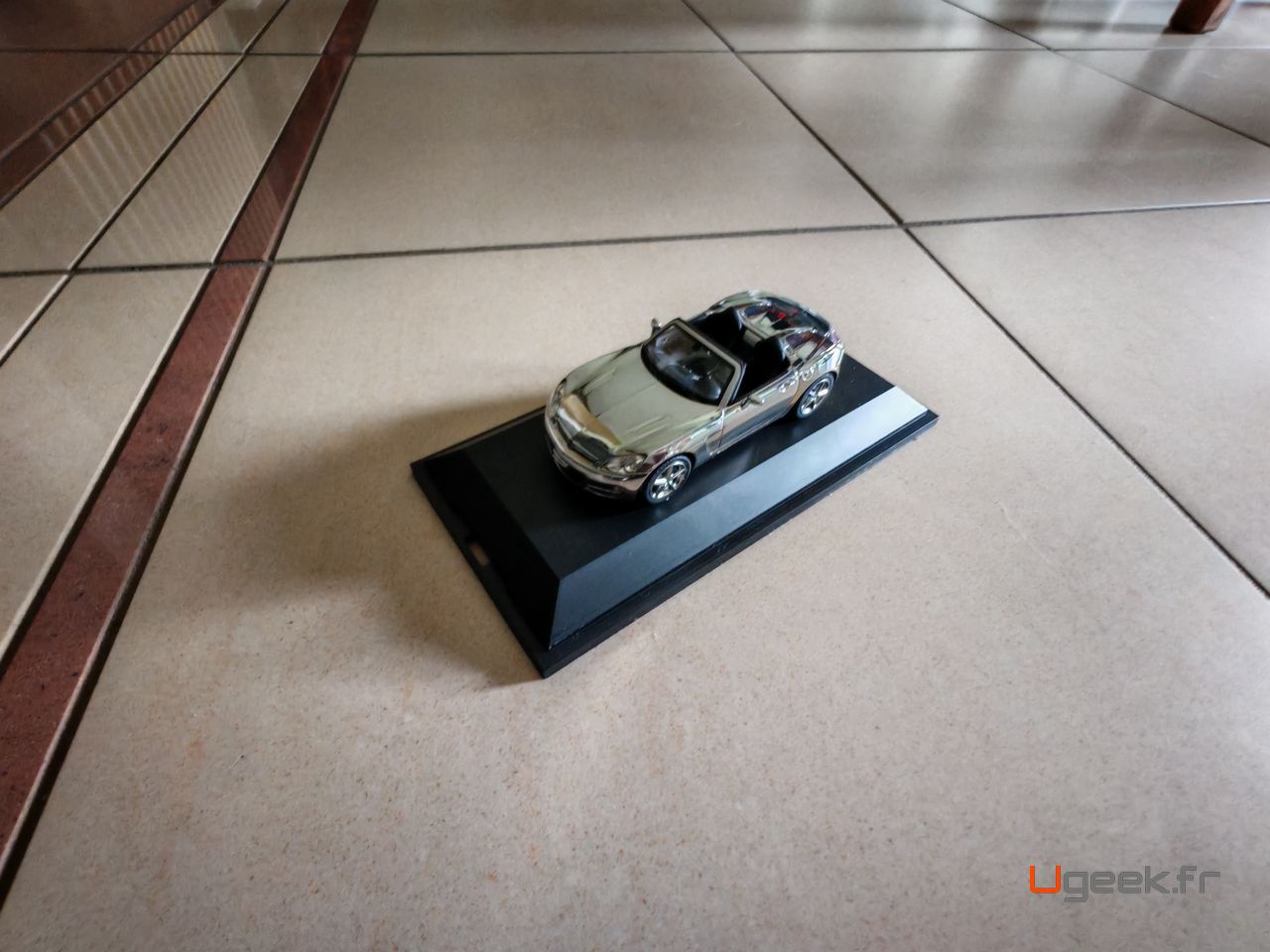 On complique un peu les choses avec une miniature Schuco de l’OPEL GT Roadster Limited Edition 1-700, peinture chrome, en intérieur avec faible luminosité. Toujours en mode automatique, zoom 0.6x, 1x, 2x et 2.5x.