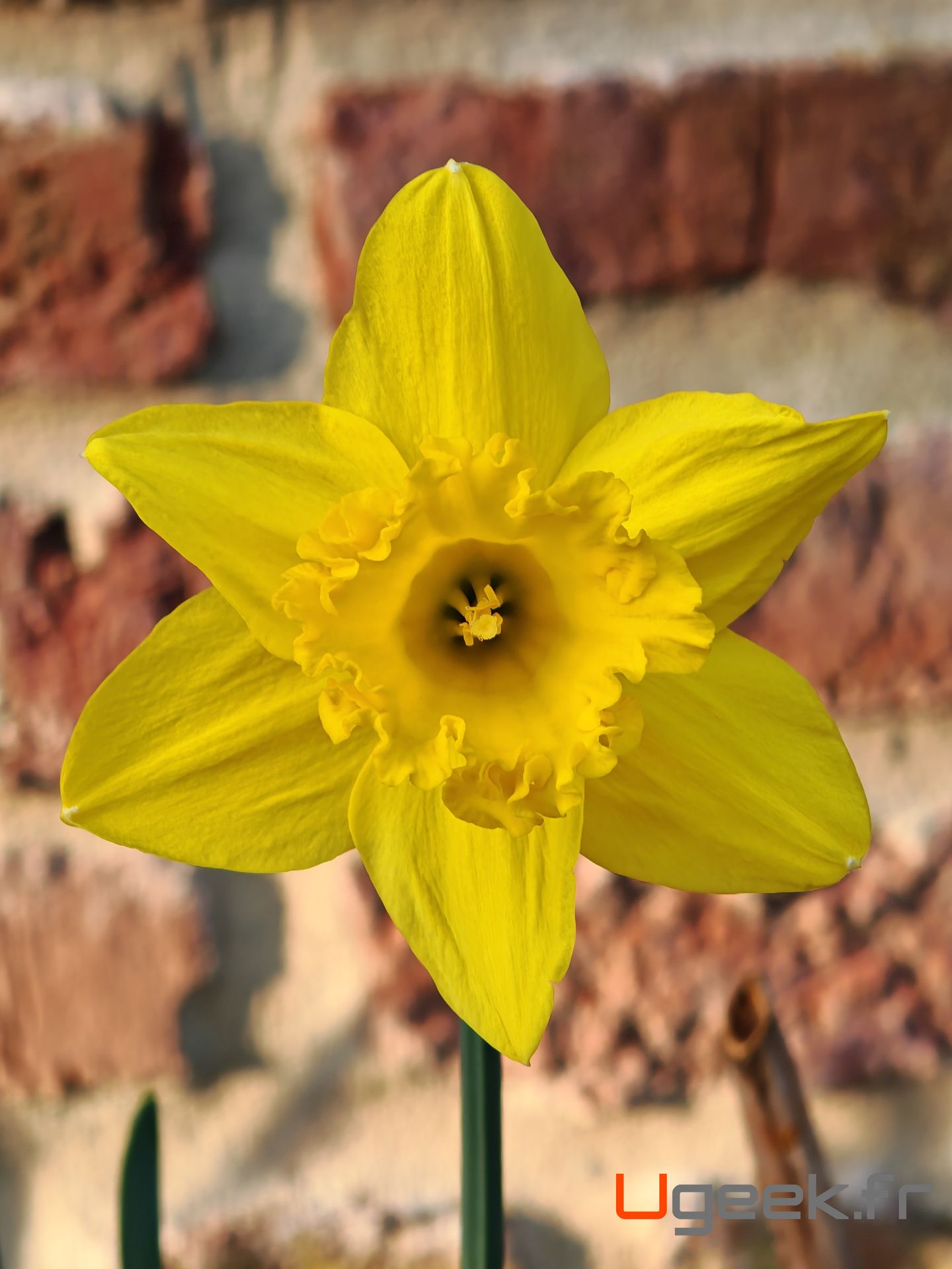 Le printemps arrive, les plantes poussent. C’était l’occasion de prendre un cliché de cette fleur avec des couleurs naturelles, un contour très net pour un flou maîtrisé avec le mur qui se trouve une vingtaine de centimètre derrière.