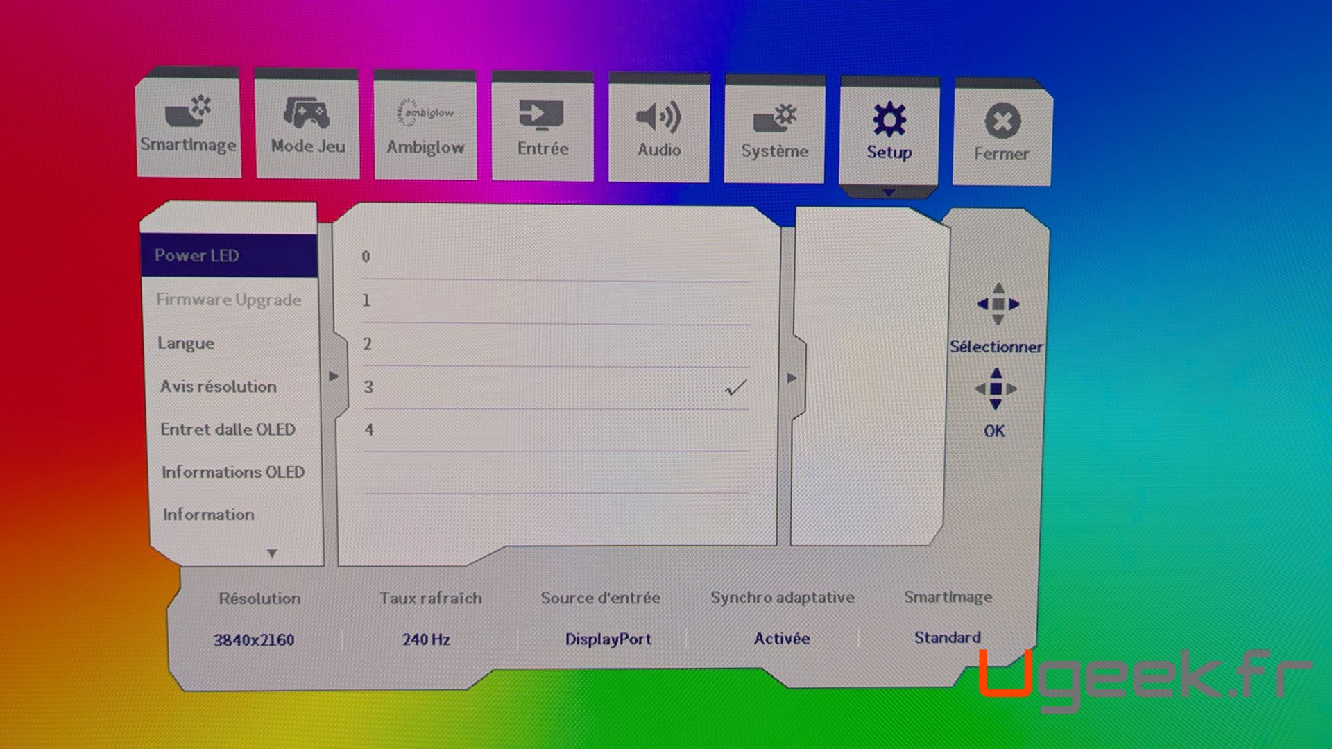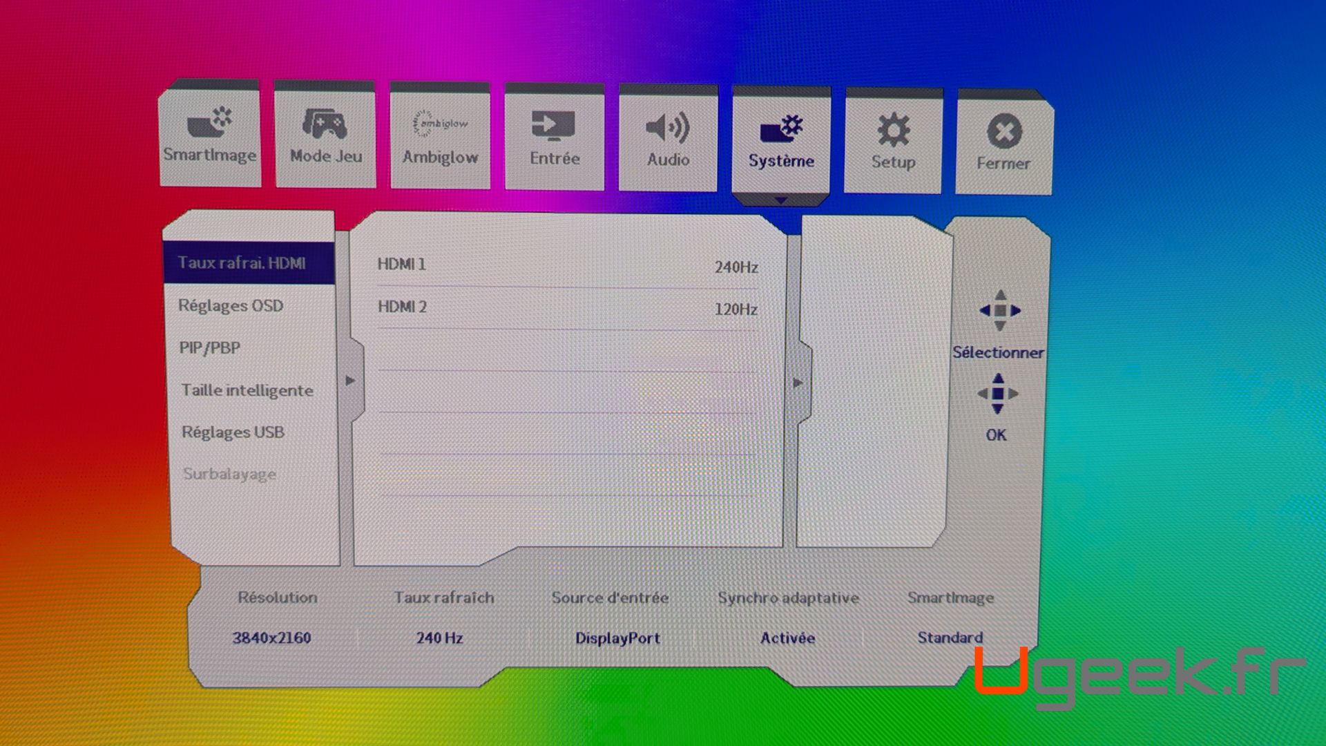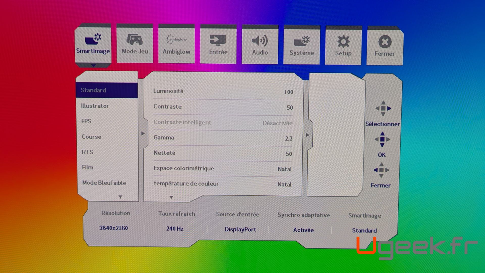 Le menu OSD est composé de sept catégories : SmartImage, Mode jeu, Ambiglow, Entrée, Audio, Système et Setup. L’ensemble comprend des sous-catégories, le tout accessible avec le bouton marche / arrêt qui fait office de joystick de navigation.