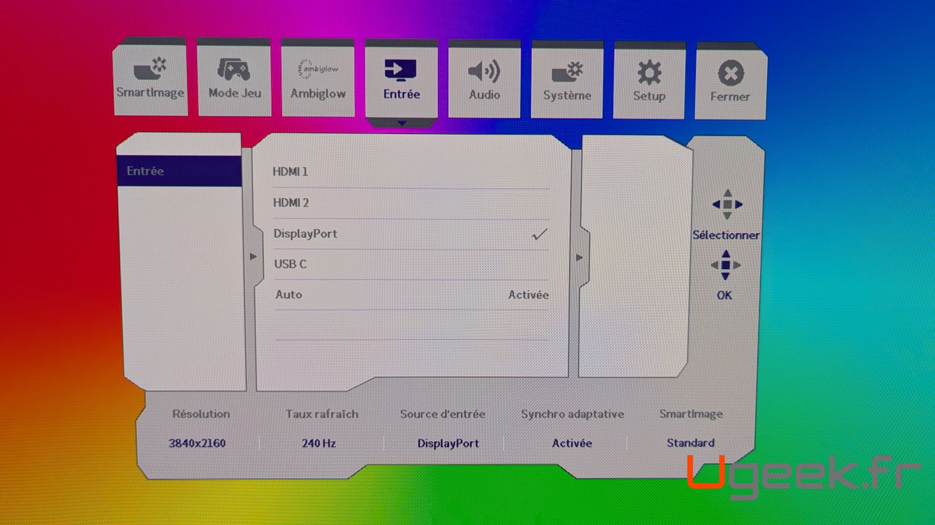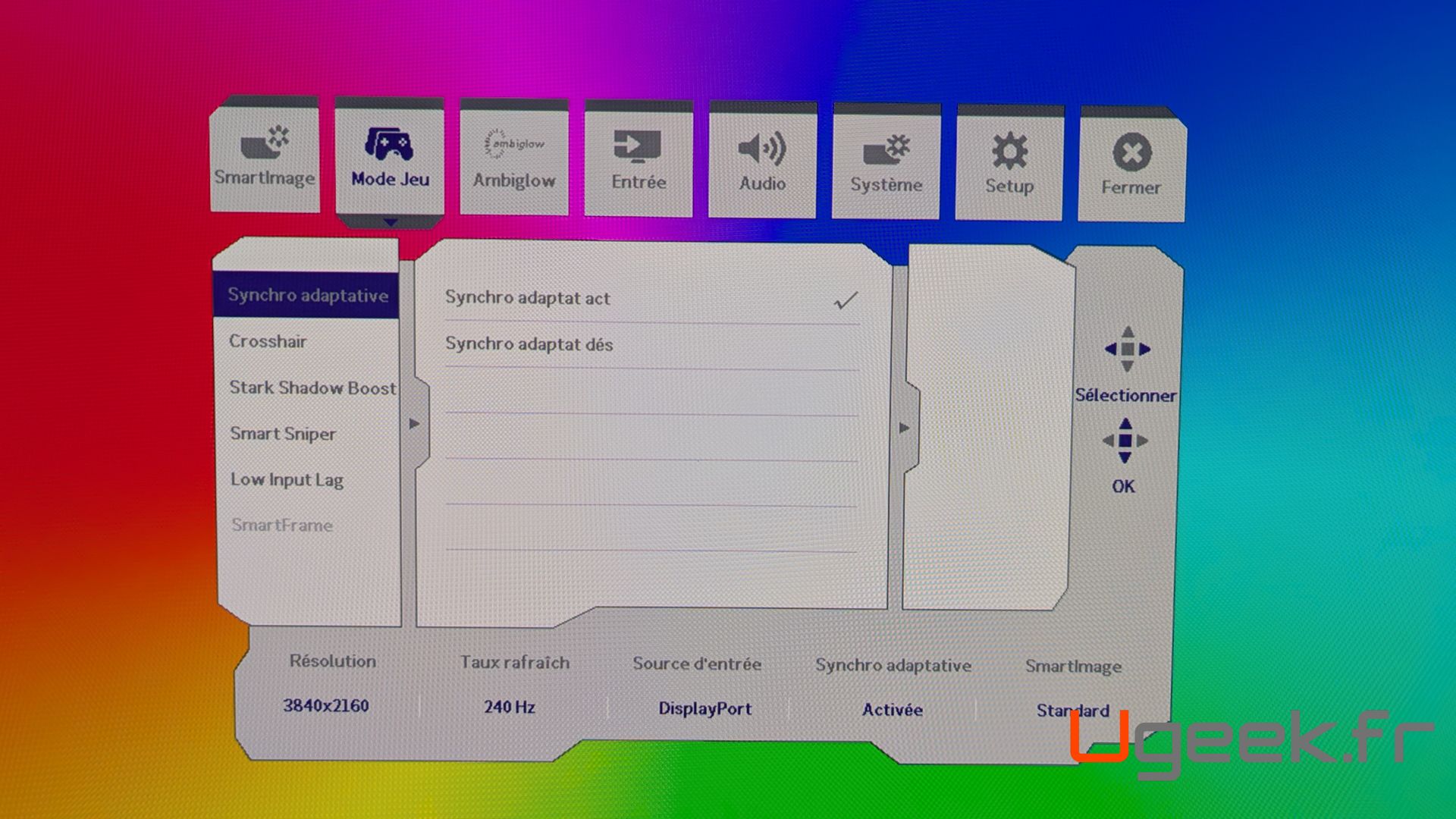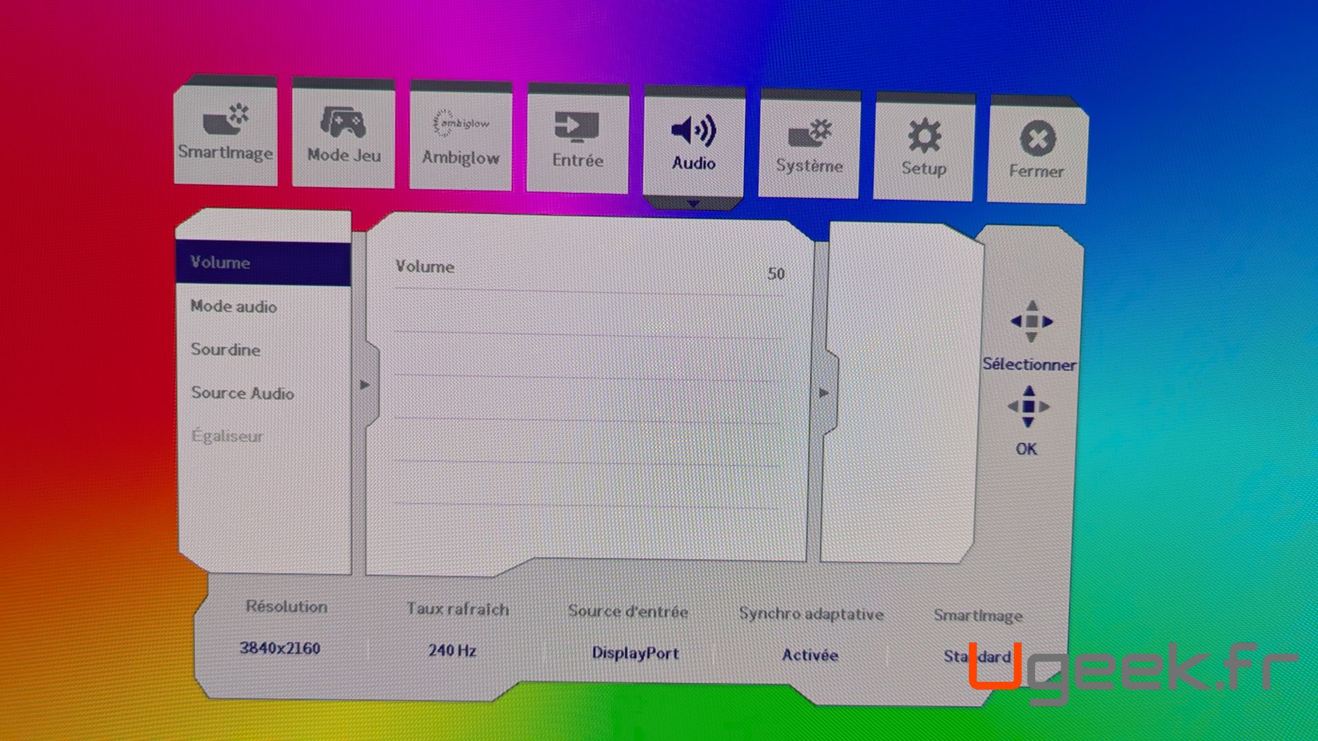 Le menu OSD est composé de sept catégories : SmartImage, Mode jeu, Ambiglow, Entrée, Audio, Système et Setup. L’ensemble comprend des sous-catégories, le tout accessible avec le bouton marche / arrêt qui fait office de joystick de navigation.