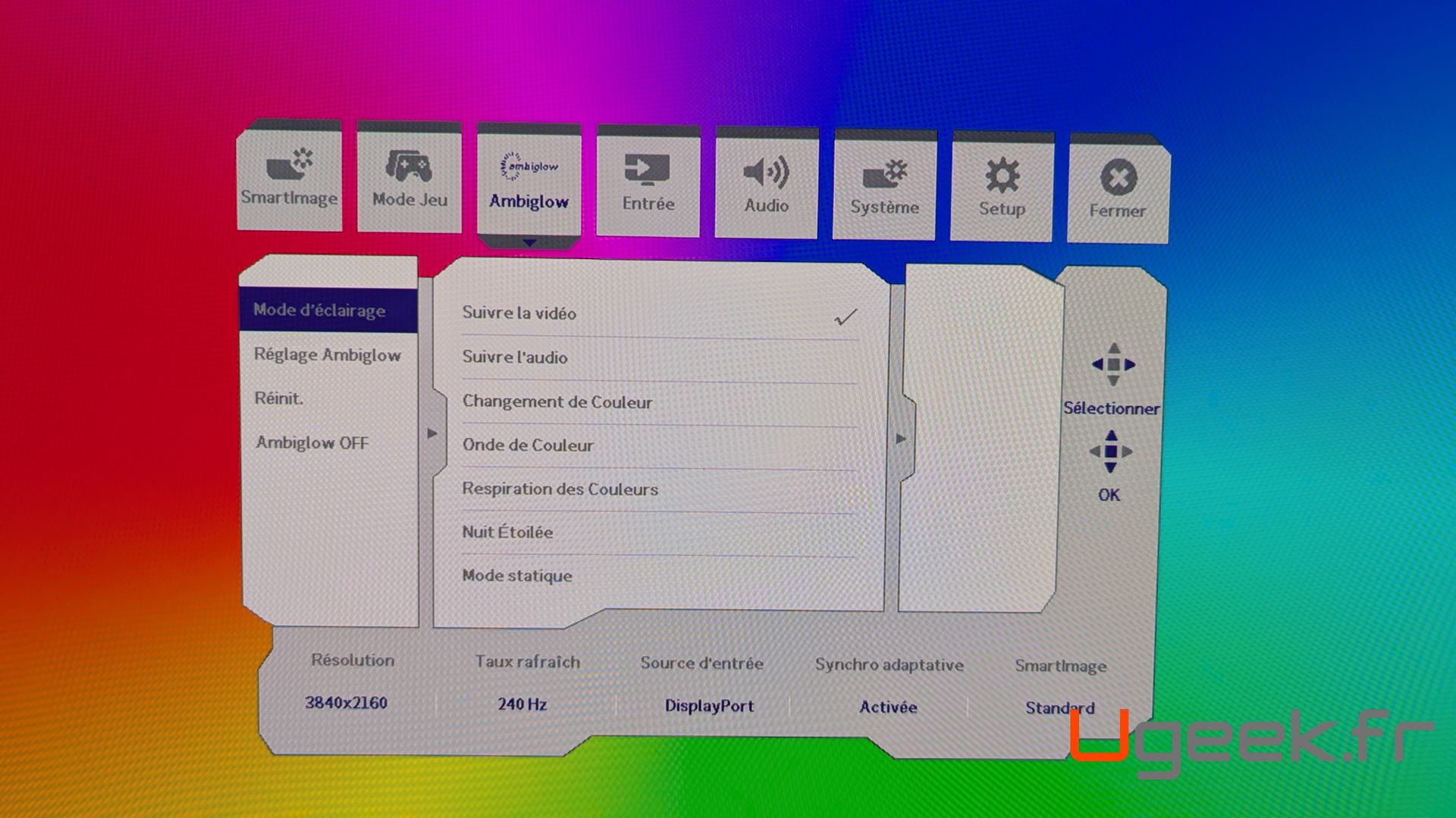 Les modes Ambiglow ainsi que l’intensité peuvent être réglés depuis le menu OSD. Ci-dessous, une vidéo d’une trentaine de secondes avec l’Ambiglow en mode « Suivre la vidéo » et l’intensité lumineuse au maximum.