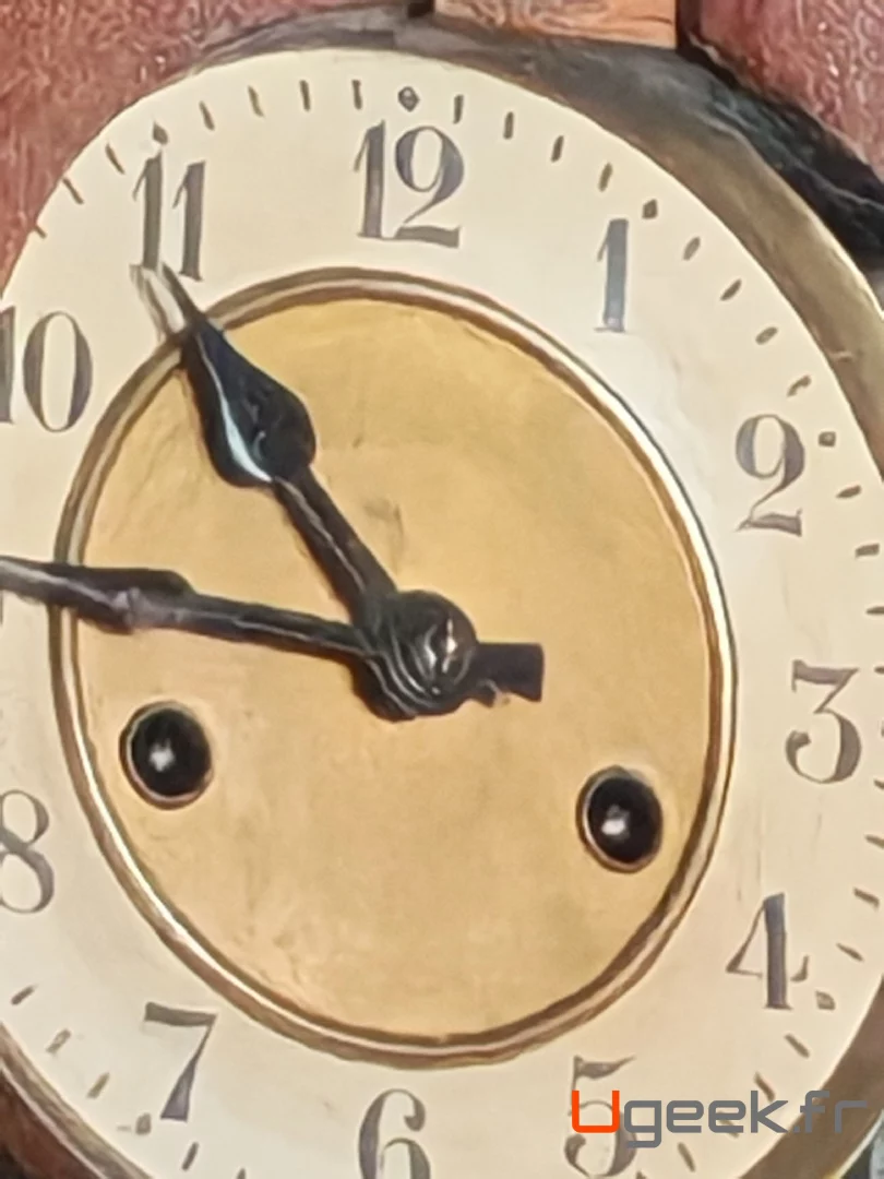 Cas plus difficile, en intérieur avec un premier cliché sans zoom et le second avec le zoom au maximum, soit x30. Sans zoom, les couleurs sont moins naturelles et l’image semble granuleuse. Avec le zoom au maximum, c’est à dire x30, les détails du cadran sont lissés et quelques « déformations » apparaissent. Le traitement IA fait tout de même son travail face à cette situation complexe et qui sera rarement nécessaire.